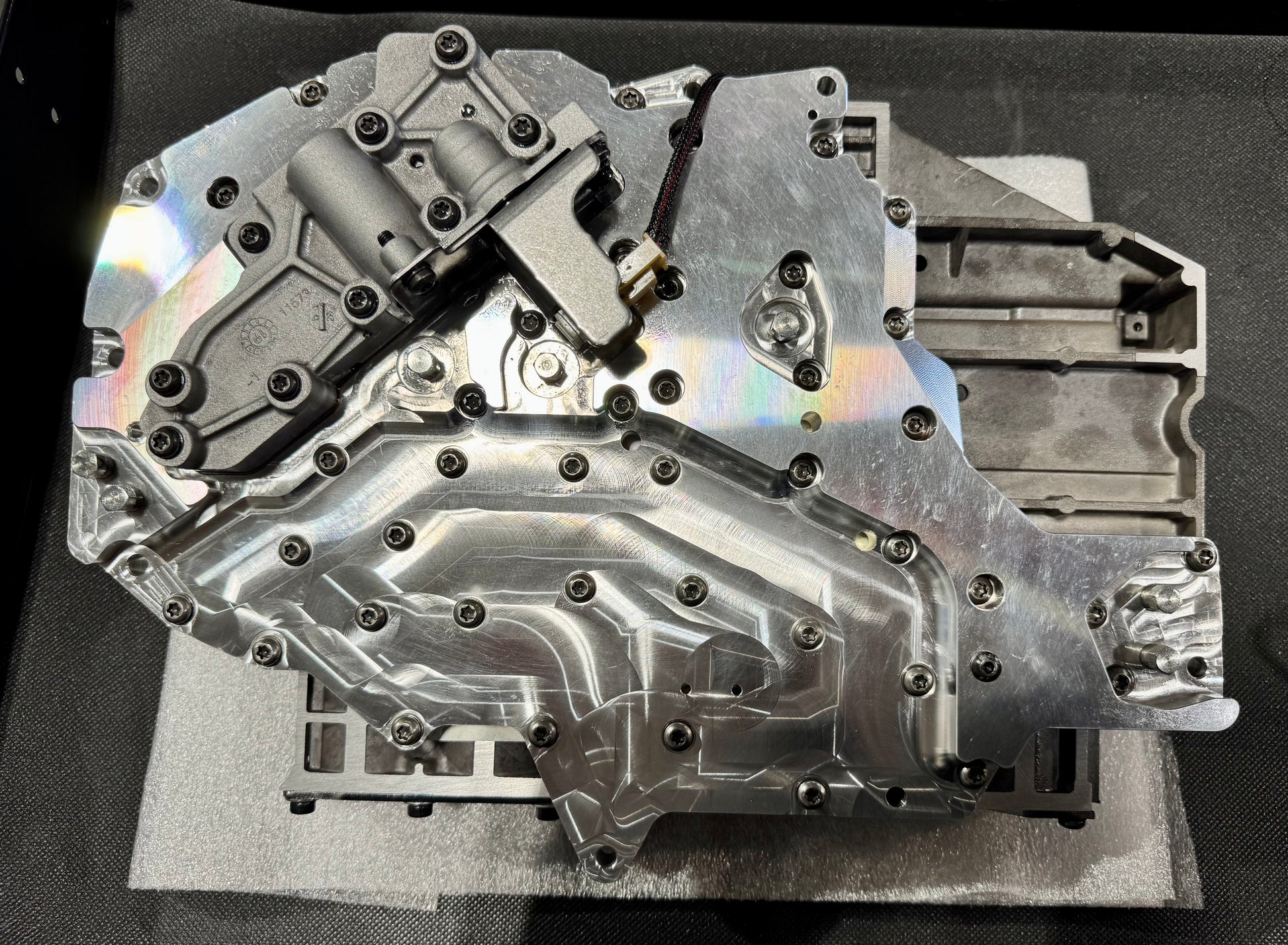 We start with ultrasonically cleaned, inspected, qualified core parts to ensure they are useable for the remanufacturing process. Ream and vacuum check the SSV bore and valve, as this is a crucial step. The accumulators get replaced with billet aluminum, triple sealed pieces. Drill and tap for an HD accumulator plate, that minimizes the chances for blow outs. We flat sand both the main valve body casting and channel plates to ensure true flat surfaces. The OEM separator plate is junked for a thicker plate that is reconfigured to achieve the 225psi most aftermarket tuning commands for, yet the VB can be configured for stock 160-170psi commands. We top these units off with a NEW OEM Mopar solenoid block, tower seals, and everything torqued to specifications.